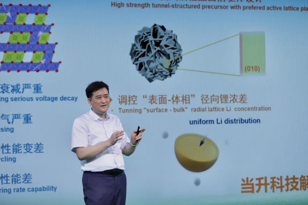 当升科技超高镍无钴材料采用特殊的结构设计,同时配合多元素ppm级协同掺杂、体-界-表多层级修饰等新技术,成功解决超高镍正极材料在容量、倍率、循环、安全等方面的问题,技术性能指标大幅提升,得到了国内外客户的高度认可。针对固态锂电所面临的正极与电解质固固界面问题,公司通过独特的反应模型实现了超高镍材料的高度单晶化,成功研发出双相复合固态锂电正极材料和固态电解质新产品,并率先与清陶能源、卫蓝新能源等业内领先的固态锂电池供应商签署战略合作协议,合计向上述两家供应不少于5.5万吨固态锂电正极材料。除上述新品,陈彦彬还详细介绍了新型富锰正极材料、磷酸锰铁锂材料以及新一代钠电正极材料的相关产品特点和技术突破。