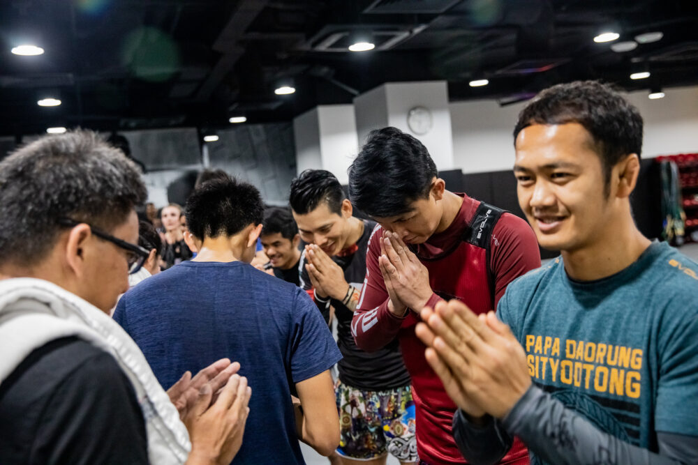 After sparring, the use of the wai is used. In Thailand, this hand gesture accompanied by a slight bow is a high form of respect. The palms come together in a prayer-like gesture showing respect. This gesture originates from India where it is known as the Añjali Mudrā, which is used in Buddhism and Hinduism.