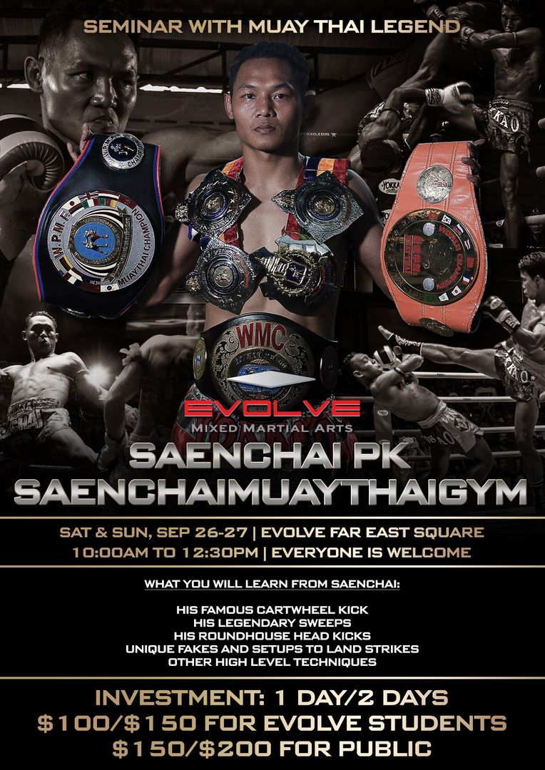There’s no denying that Saenchai has right to be the greatest Muay Thai legend in history. And on the 26th and 27th of September, Saenchai will holding an exciting 2-day seminar at Evolve MMA. Don’t miss your chance to meet and learn from the living legend himself!